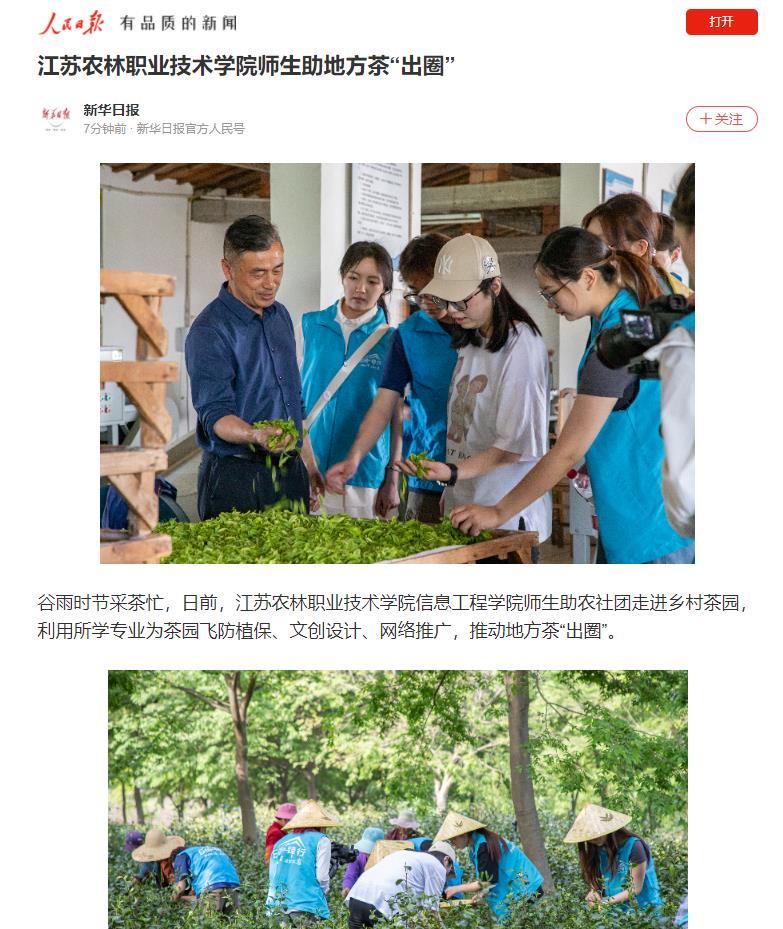 谷雨时节采茶忙,日前,江苏农林职业技术学院信息工程学院师生助农社团走进乡村茶园,利用所学专业为茶园飞防植保、文创设计、网络推广……推动地方茶“出圈”。