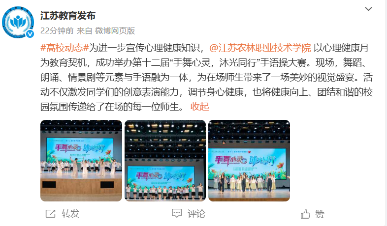 【江苏教育发布】微博报道我院“手舞心灵,沐光同行”手语操大赛